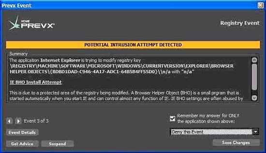 Pendant qu'on navigue sur Internet, aussitôt que Prevx s'aperçoit qu'une modification à votre système s'annonce, une fenêtre s'ouvre vous demandant d'accepter ou de refuser (Deny - Refuser) la demande de modification. Ceci est probablement un des plus grands reproches à ce logiciel car les conseils sont souvent trop techniques pour l'utilisateur. Il devient alors presque impossible de faire le bon choix. Dans ce cas d'alerte si vous n'êtes pas certain, mieux vaut refuser.